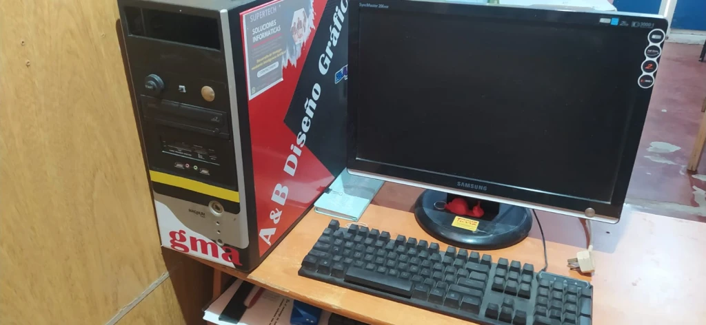 Pc de escritorio completo con monitor, teclado y mouse en excelente estado, equipado con sistema operativo Windows 10.